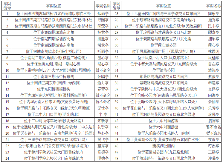 滁城亭阁命名活动经过社会大众征名、专家评选推荐、社会大众票选、亭阁命名领导小组复核审查,最终确定了43个亭阁名称,现将结果公告如下: