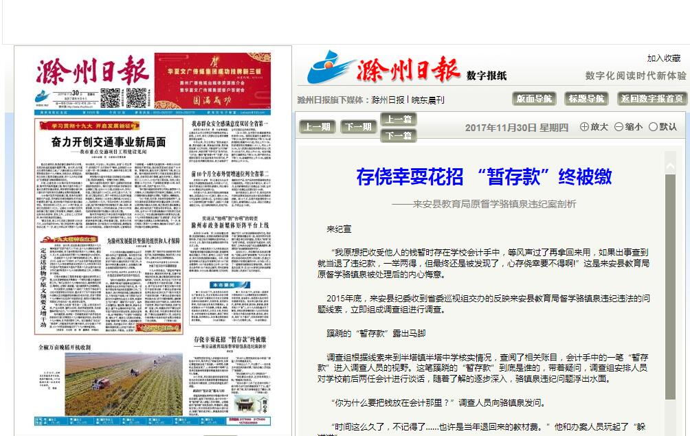 调查组根据线索来到半塔镇半塔中学核实情况,查阅了相关账目,会计手中的一笔“暂存款”进入调查人员的视野。这笔蹊跷的“暂存款”到底是谁的,带着疑问,调查组安排人员对学校前后两任会计进行谈话,随着了解的逐步深入,骆镇泉违纪问题浮出水面。