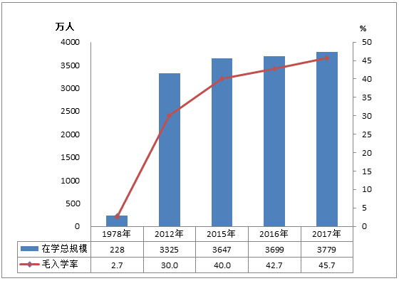 图5 1978年、2012年、2015-2017年高等教育在学规模和毛入学率